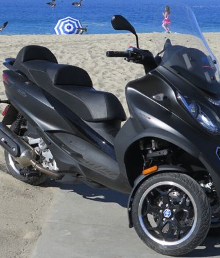 Forty horsepower are plenty for a scooter; dropping the hammer when the light turns green leaves everybody in the dust and drowns out the annoying “beep” the MP makes when the thing that keeps it upright stops doing it. In spite of Peter Egan’s observation that the real purpose of a trike is to allow you not to miss any bumps in the road, the MP3’s 16.5-inch track means you can avoid a lot of them just like on a motorcycle. And it deals with the ones you can’t avoid pretty well thanks to nearly four inches of wheel travel up front, and 4.25 inches out back, controlled by a pair of preload-adjustable shocks.