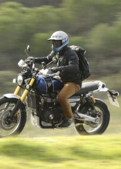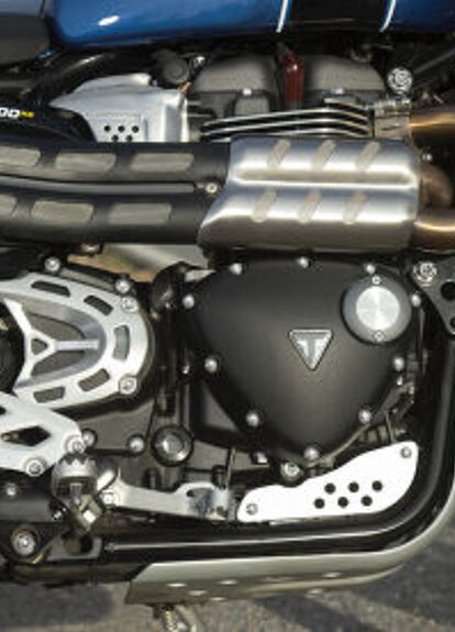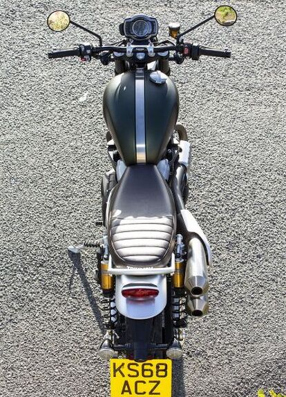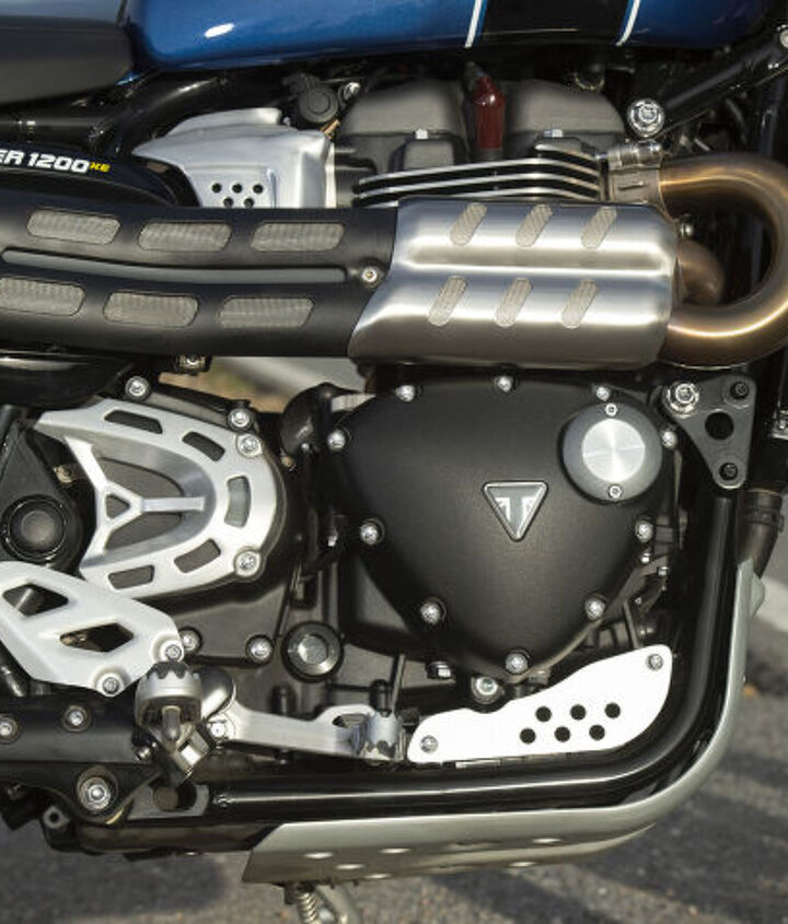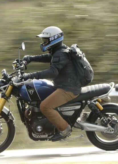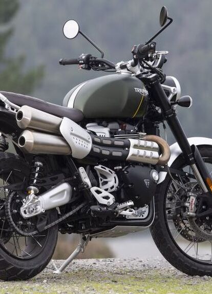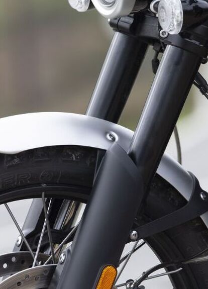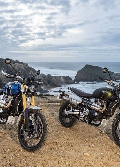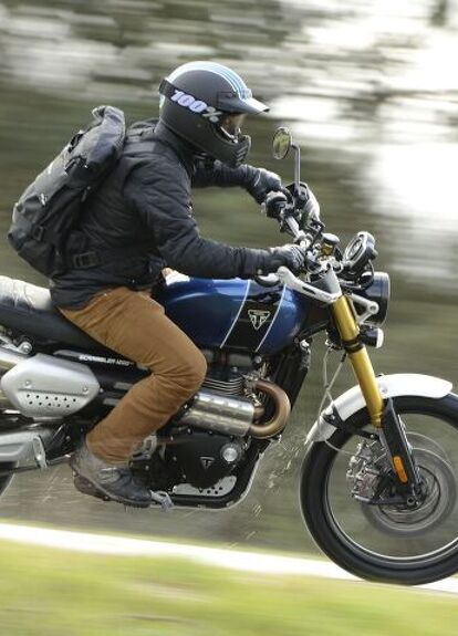The Scrambler 1200s also received a bespoke tubular steel frame with aluminum cradles which incorporates a new headstock and geometry said to be better tailored for comfort as well as off-road capability, with removable passenger footrests. Ergos on both bikes are quite comfortable while sitting or standing, a sentiment which was echoed by riders of all sizes during our ride. The XE comes with a 2.5-inch wider handlebar and taller handlebar risers which are optimal while standing without being awkward while seated and also provide extra leverage. Risers on both models are reversible to suit rider preference. Ergonomics for both bikes are comfortable enough for all-day riding, though if you plan on doing extensive highway stints or touring, you’ll have to get used to the wind blast or find an accessory windscreen (the Triumph catalog offers a clear touring windscreen). The lack of windscreen didn’t bother me much, though we didn’t do much highway riding, and I’ve owned (and toured with) many bikes without wind protection.