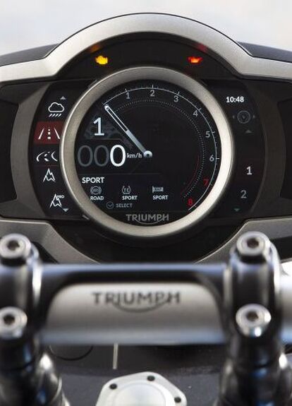 Both Scrambler 1200 models include five rider modes including Rain, Road, Sport, Off-road, and Rider (customizable). The XE model takes its off-road chops a step further with Off-road Pro, a mode which disables traction control and ABS entirely. The standard Off-road mode found on both models uses a specific off-road ABS and traction control (traction control can be switched off on both models however, ABS can only be switched off entirely on the XE). Once the ignition is switched off and back on, the bike will revert to a street ABS equipped mode even if shut off in one of the two off-road settings. If you’re simply taking a breather trailside and use the kill switch to turn off the engine, the bike will stay in the selected rider mode.