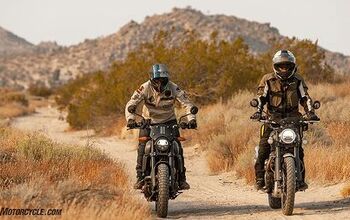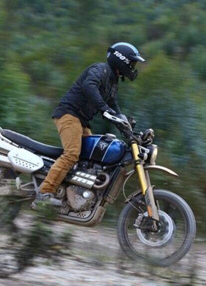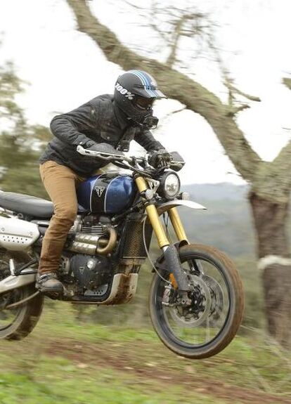 The XC comes with an inverted 45mm Showa fork complete with 7.9-inches of travel, as well as Öhlins twin shocks with piggyback reservoirs also allowing for 7.9-inches of travel. The XE uses a 47mm gold inverted Showa fork with the same Öhlins components out back that are slightly longer, giving the XE 9.8-inches of travel at both ends. Both suspension setups are fully adjustable front and rear for preload, rebound, and compression and feel firm and planted. Perhaps one of the most talked about and pleasantly surprising aspects of the bike among editors on our press ride was the performance of the suspension. More than adequate for most off-roading and stable on-road, the suspension feels firm, but in a performance-driven way, particularly while maintaining composure at speed off-road. The Scrambler 1200s both handled g-outs and rocks with ease. My only complaint would come when bottoming the forks while jumping the XE on a motocross track. Of course, jumping a 482-pound (an approximation given Triumph’s dry weight claim of 452-pounds for the XC and 456-pounds for the XE) motorcycle can have this effect. If you plan on doing lots of sick jumps, you may want to look into getting some suspension work done, if you’re not planning on this, the stock setup is more than adequate for most situations on-road and off.