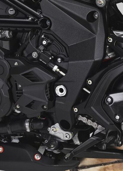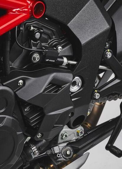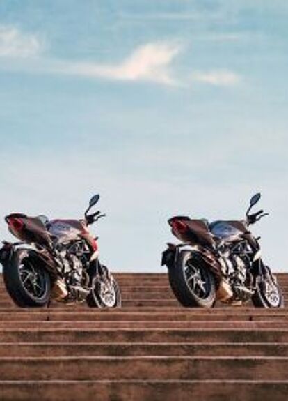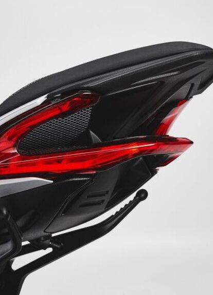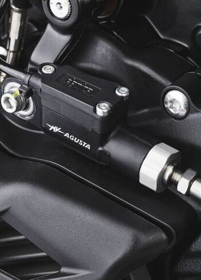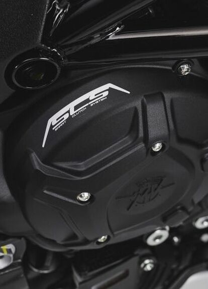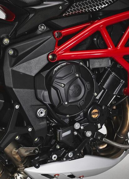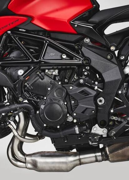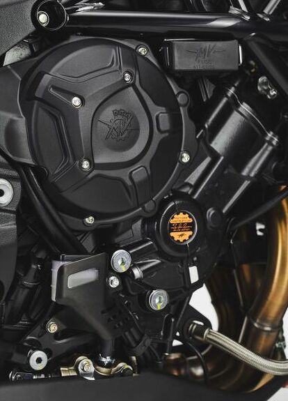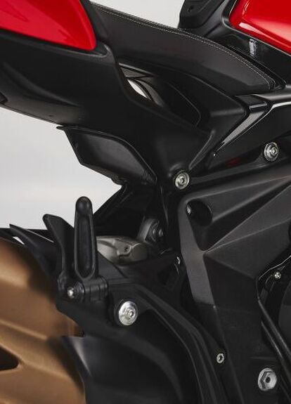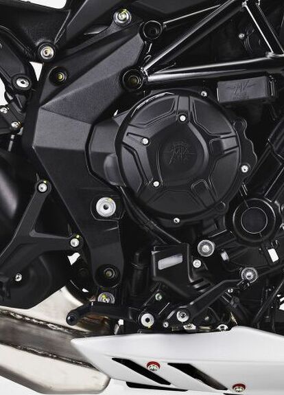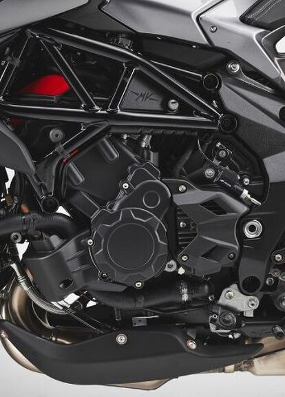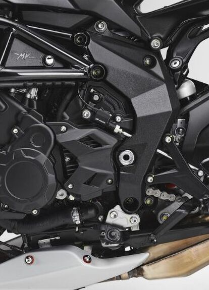 Moving to the hardware side of things, both bikes keep the counter-rotating 798cc Triple. It’s now Euro 5 compliant and MV says it still pumps out 140 hp. A redesigned exhaust system surely helps it meet tightening emission requirements, while inside the engine DLC-coated tappets and sintered valve guides help keep the top end more reliable. New fuel injectors raise injection pressure from 3.5 bar to 4.0. Down below you’ll find new crankshaft main bearings, piston rod bearings, and countershaft bearings to reduce friction. On the gearbox side, EAS 3.0 has a new sensor for faster, smoother, more accurate gear changes.