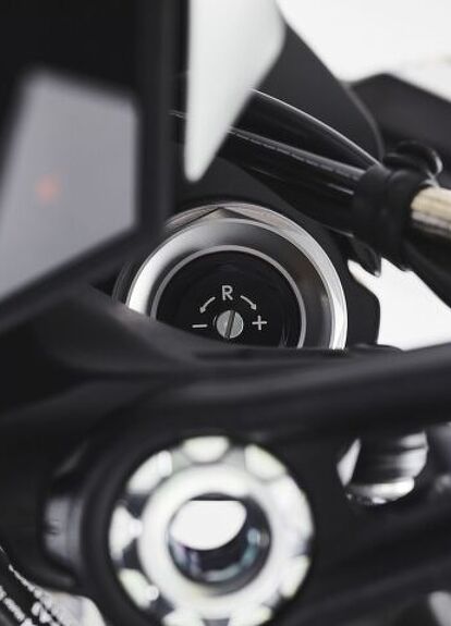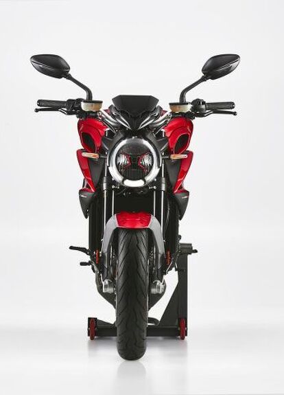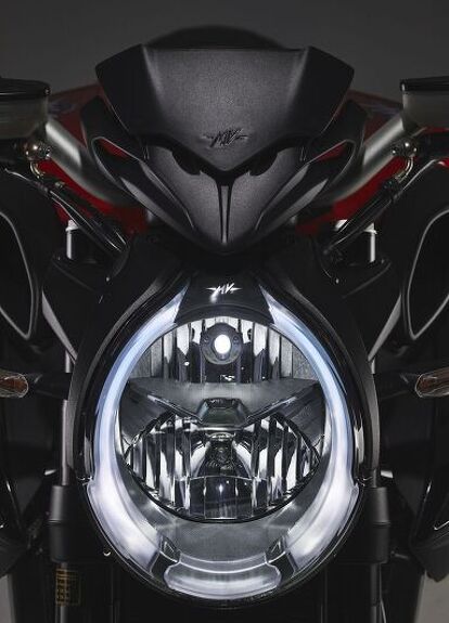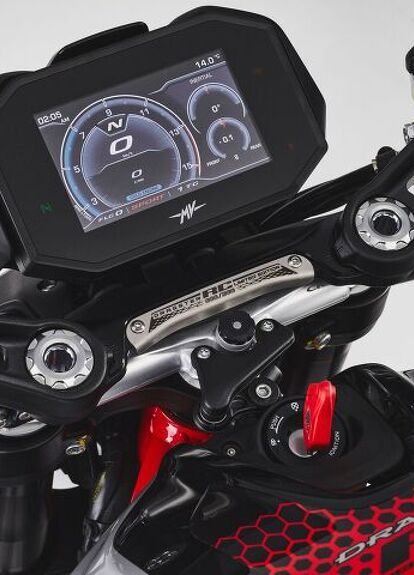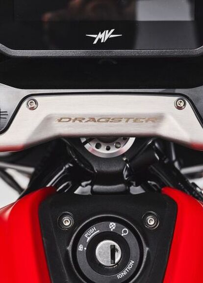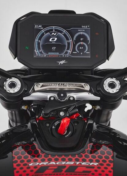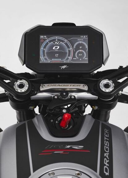 Love them or hate them, the Brutale and Dragster RR are not motorcycles you’re ambivalent about. The minimal yet angular styling for this middleweight streetfighter family is as stunning as ever, even down to the three styled exhaust outlets that expel the 798cc Triple’s spent gasses. With the Dragster the extremely short tail section helps the eye capture the extreme compactness of the bike, while the wire-spoke wheels are proudly on display to enhance the stunning image. But these days in the sportybike world it seems you’re only as good as your electronics package, and MV Agusta has finally joined the modern age.
