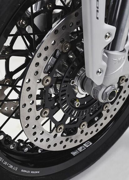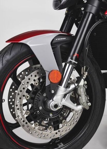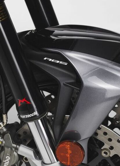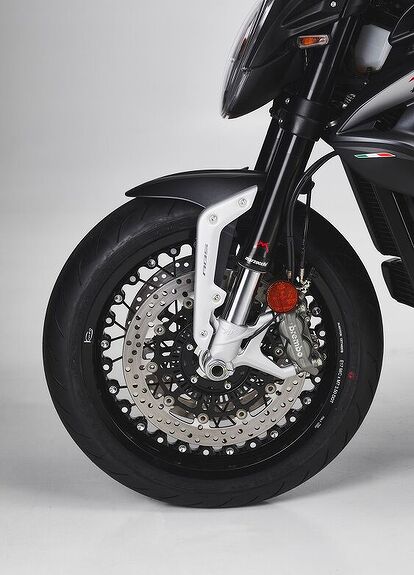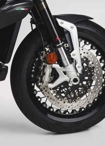| Front Brake | Double floating disc with 320 mm (12.6 in.) diameter, with steel braking disc and flange, Brembo radial-type calipers with 4 32 mm pistons 32 mm (1.26 in.). Cornering ABS standard |