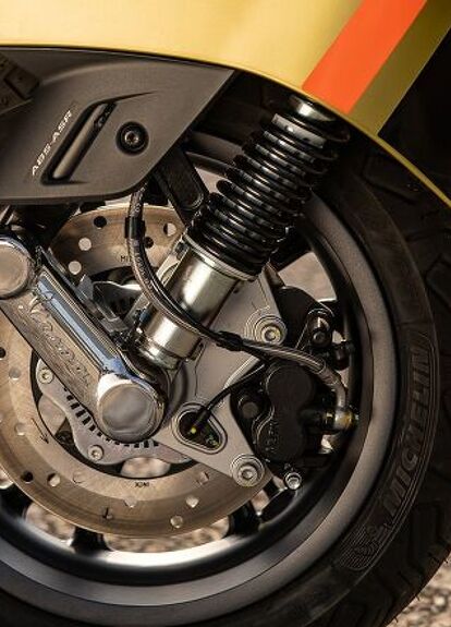 The ancient streets of Rome familiarized me with the benefits of the GTS’ other update: the front suspension retains its single-sided, trailing-link design that was originally sourced from aircraft front landing gear designs. For the new model year, the front suspension has four pivot points, which Vespa claims reduces the system’s friction and allows the front wheel to track better over pavement irregularities. The rear suspension retains its dual shocks, but they were revalved and feature four preload settings. The end result is a relatively short-travel suspension that is noticeably better at handling the bumps frequently encountered in urban settings. For example, many of the streets in the older sections of Rome are made of small cobblestones, and the GTS soaks them up. The word I would use to describe the suspension action is supple. However, the shortness of the stroke, and the tiny wheels, means that you will still feel potholes all the way up your spine.