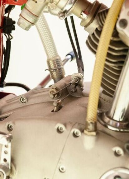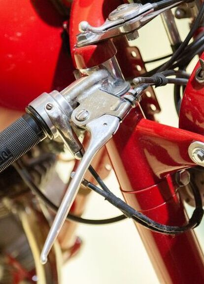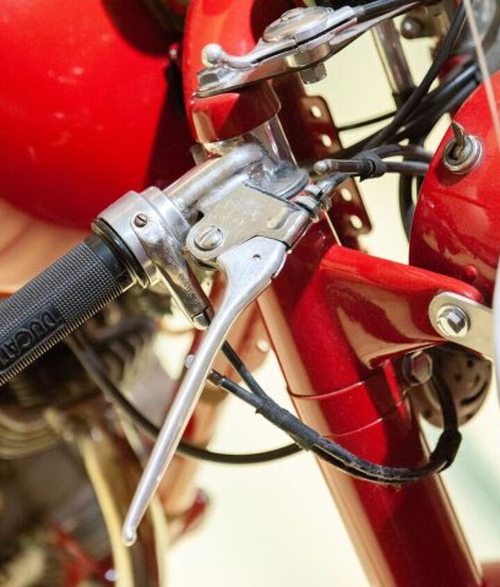 Starting at the engine, it’s plain to see that this is not a desmo cylinder head since, yes, those are exposed valve springs. The valve springs were exposed on purpose so they could be replaced easily, if needed, in the middle of a long, grueling 1000 km race. If you look carefully (you might need to click the picture to expand it) behind the cylinder you might notice two clutch cables. One operates the clutch while the other is a spare in case the primary breaks. Again, making it to the end by all means necessary was the key. Look throughout the frame for bracing (the upper right corner is the most noticeable) and you’ll also see holes drilled throughout. Why? For lightness, of course.