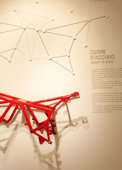 If you’re wondering, no, the bike in the picture is not the bike Tartarini and Monetti rode. The illustration on the wall above the bike is a 1:1 schematic drawing of the model, before CAD was around.