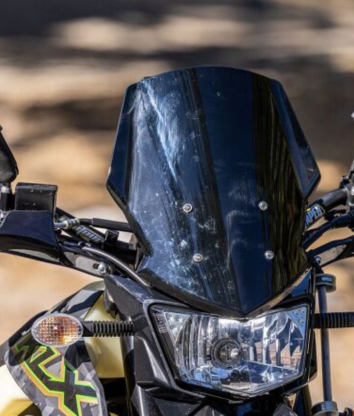 Since I frequently ride a naked bike, I initially scoffed at the idea of putting a windscreen on the KLX. After all, it will rarely top 70 mph, and the wind blast isn’t too intense at that rate. However, after my first extended highway ride on the little 300, I noticed that the fuel economy dropped significantly at 70 mph and above, making me wonder if mounting a windscreen might make the air flow around my body more efficiently and give that little 300cc Single a break.
