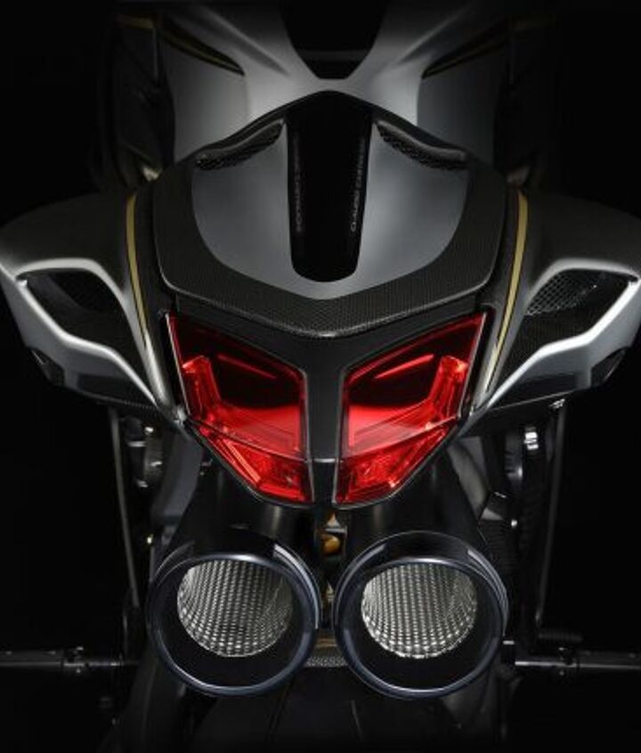 The rev limiter is set at 14,200 rpm; titanium con-rods provide the best possible strength-to-weight ratio. The crankshaft has been specifically balanced and lightened for this Corsa Corta power unit, which bristles with original design features such as a perfectly balanced central timing chain and radially-set valves in the combustion chamber. With the bike configured for the track, maximum power is 212 hp (158 kW) at 13,450 rpm, with torque