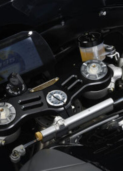 Titanium has also been used in the bolts and screws, while CNC-machined aluminium alloys are used extensively on functional components such as the triple clamp (now significantly lighter), the height-adjustable rider footpegs, the nut holding the rear wheel (mounted on the splendid swingarm), the brake and clutch levers, the racing push-buttons, the clutch and brake fluid reser-voir plugs and filler cap.
