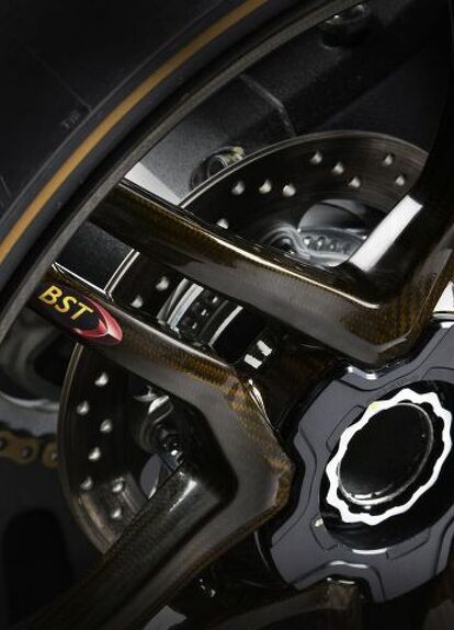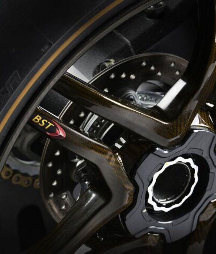 Design is also enhanced by a golden trim consisting of electro-plated copper. The front upper fairing, side panels, lower cowl and rear seat cowl (for single-seater use) also show masterful use of carbon fibre, as do the unrivalled racing-grade BST Rapid Teck wheels.