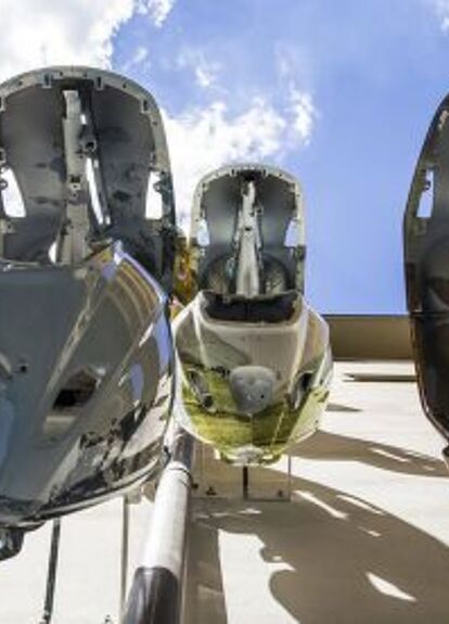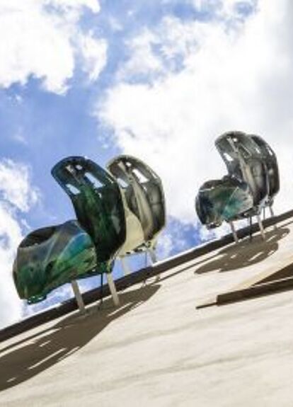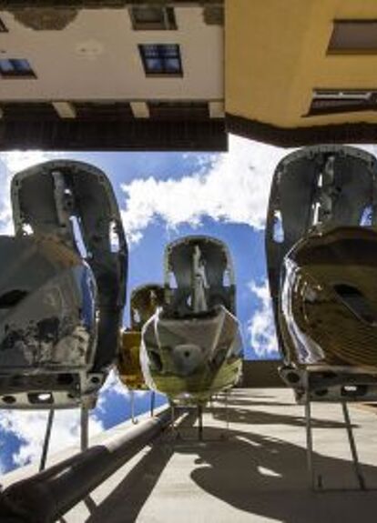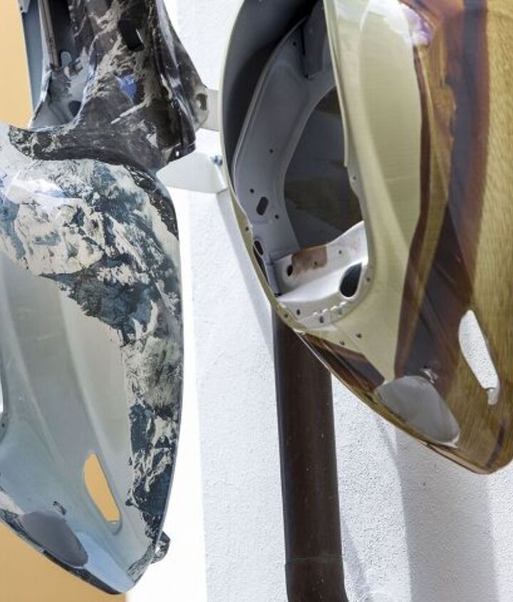 The dozen Vespa shells are joined by three other scooters on the ground, each carefully painted by artist Simone D’Auria in an exhibit titled “Freedom” as part of the broader Lungarno Collection art project. D’Auria painted each scooter’s body with a nature-themed livery using a water transfer printing technique. These include images of clouds, forests, mountains and deserts.