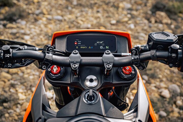 Settings can be tailored further from the new 4.2-inch TFT display, with defeatable traction control and three Bosch 10.3MB ABS settings to choose from: Standard, Offroad (rear ABS disabled), and off. A USB-C charging port is standard, and the updated display supports Bluetooth connectivity through the KTMconnect app, facilitating turn-by-turn navigation, media navigation, and more. Naturally, riders will navigate these menus with all-new illuminated switch gear featuring a four-way joystick. LED lighting is standard.