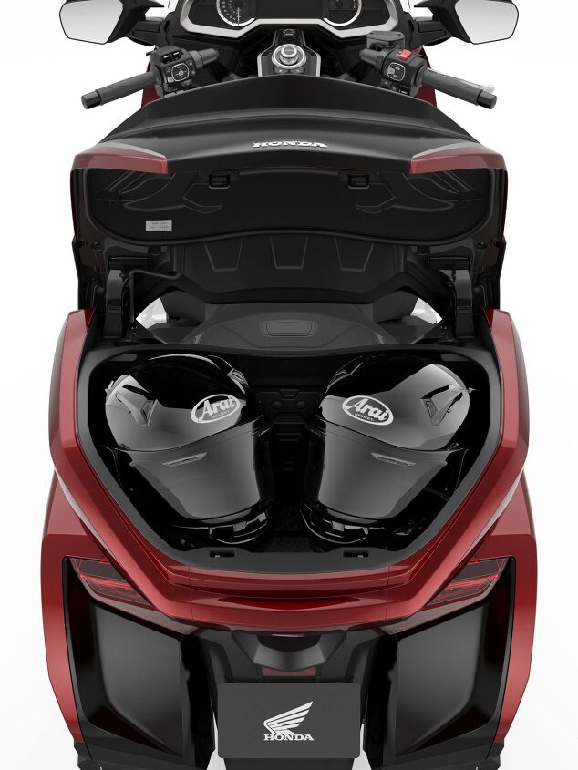 Honda sprung news today about upgrades for its 2021 Gold Wing, the biggest of them being a capacity increase for the Tour version’s trunk. Shrinkage in luggage capacity was the chief complaint with the heavily downsized 2018 ’Wing: the new trunk holds 61 liters of storage, compared to the previous 50 liters, which Honda says will easily accept two XXL full-face helmets (even when equipped with headsets).