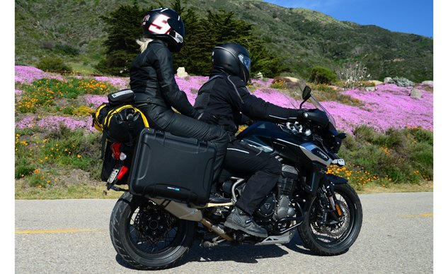 When I picked up our Triumph Tiger 1200 for a 900-mile trip up to northern California’s Monterey Peninsula, I had really hoped Triumph would have outfitted the big adventure touring bike with the OE luggage. Alas, the big trumpet was devoid of storage, save for the impressively large underseat compartment and a not-so-impressive rear rack. Thankfully, Evans Brasstacks always has a backup plan. No sooner had I called Evans whining, he was on the horn with our friends at TwistedThrottle.com working out a solution. Enter the new DRYSPEC H35 waterproof cases.